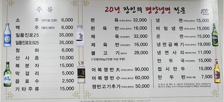 메뉴판입니다. 저희는 평양냉면(일반) 2개 / 평양냉면(곱빼기) 1개 / 접시만두 시켰습니다. 여기는 평양냉면 말고도 어복쟁반이 유명하다고 하는데... 왐마! 너무 비싸서 이 날은 안 사 먹었습니다.