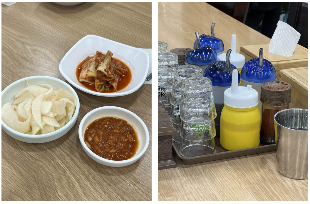 기본찬으로는 무초절임채 / 김치/ 양념 나오는데 저는 저 양념이 비빔냉면양념장인 줄 알고 평양냉면 덜어서 신명 나게 비벼먹었습니다. 오우 맛있더군요. 근데 만두 양념장이랍니다. 여러분은 냉면에 비벼드시지 마세요?