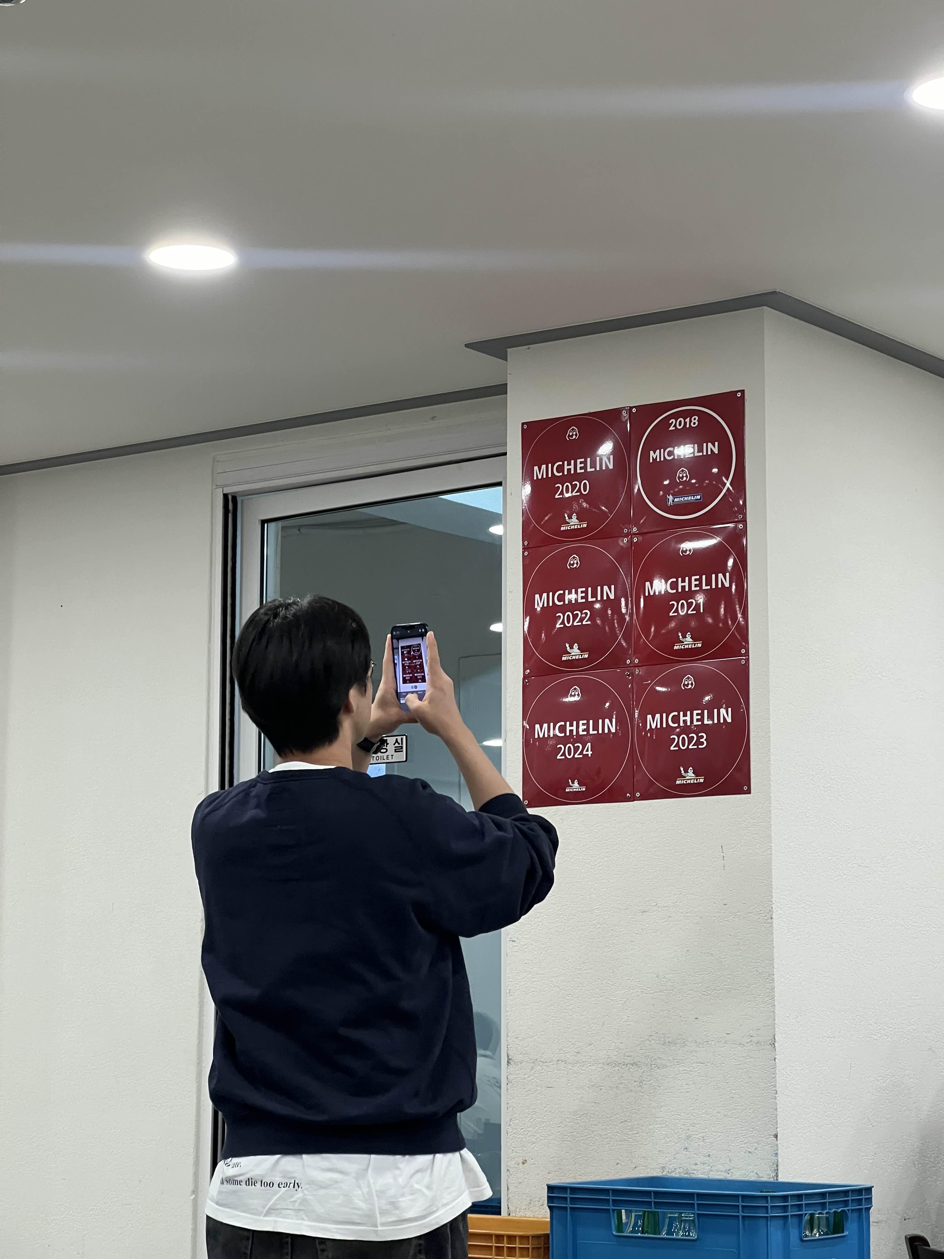몇 년째 미쉐린 가이드에 선정된 식당임을 증명하는 ..... 저걸 뭐라고 하지... 배지? 간판..? 미쉐린버튼...? 아무튼 맛집임을 증명하는 것이죠! 제 친구가 아주 잘도 찍고 있습니다.