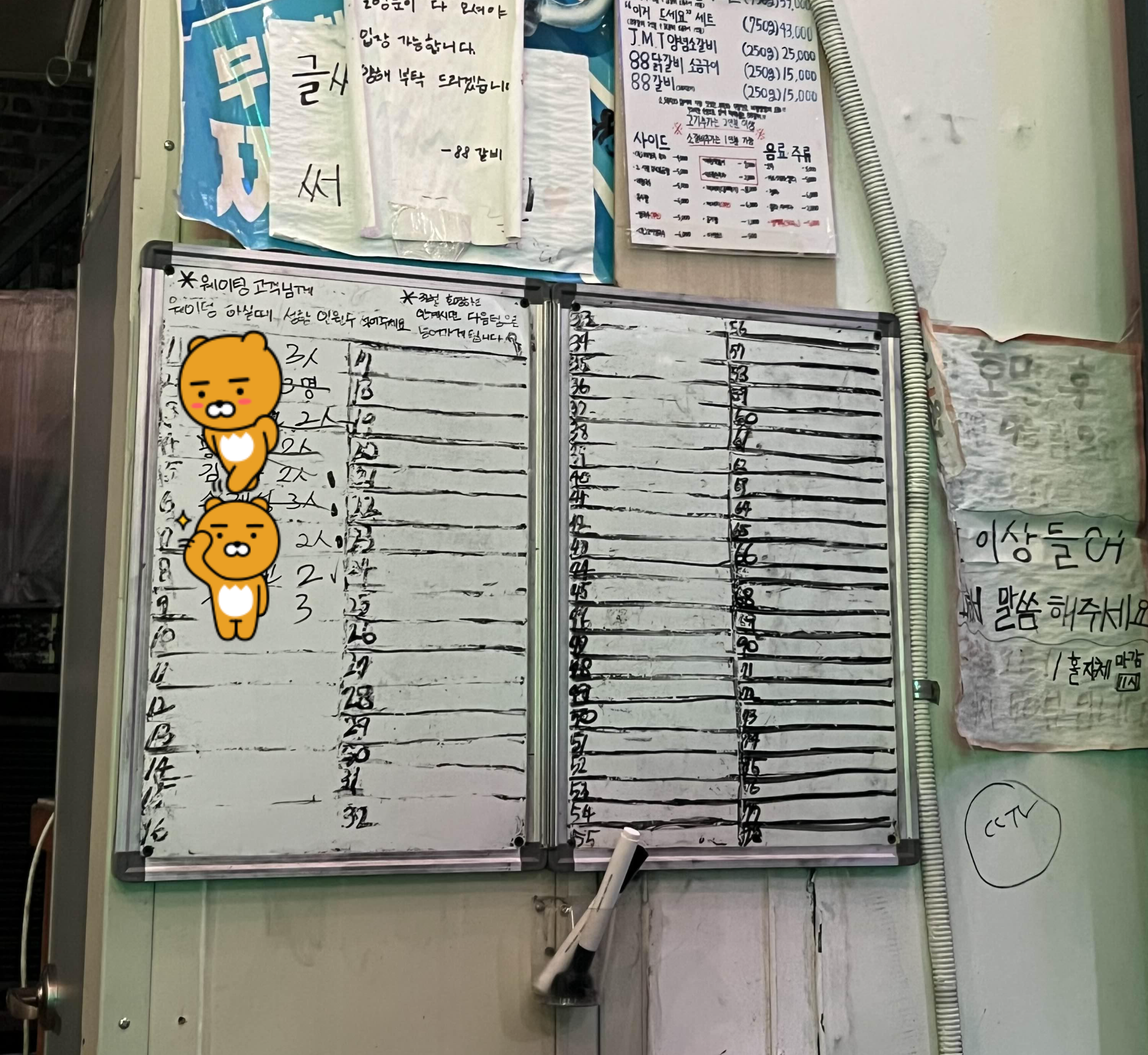 그냥 앉아서 대기하시면 안 되고 대기명단에 꼭 성함과 총인원수를 적어두셔야 합니다. 그러면 사장님께서 엄청난 일머리로 처리를 해주세요. 그리고 88갈비는 총인원이 모두 와야 들어갈 수 있다는 거! 꼭 명심하시고 방문하시길 바랍니다.