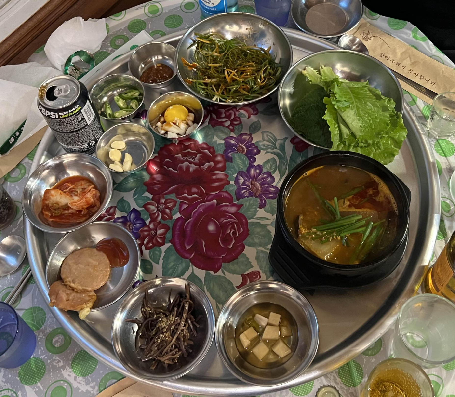 기본찬은 이렇게 나오는데 해장국은 선지 안 드시는 분들을 위해서 점원분이 미리 물어보십니다. 선지 못 드시는 분은 꼭 빼달라고 하세요! 그 외에 파절이, 쌈장, 고추, 특제소스, 마늘, 김치, 분홍햄부침, 고사리, 무절임으로 구성되어 있습니다