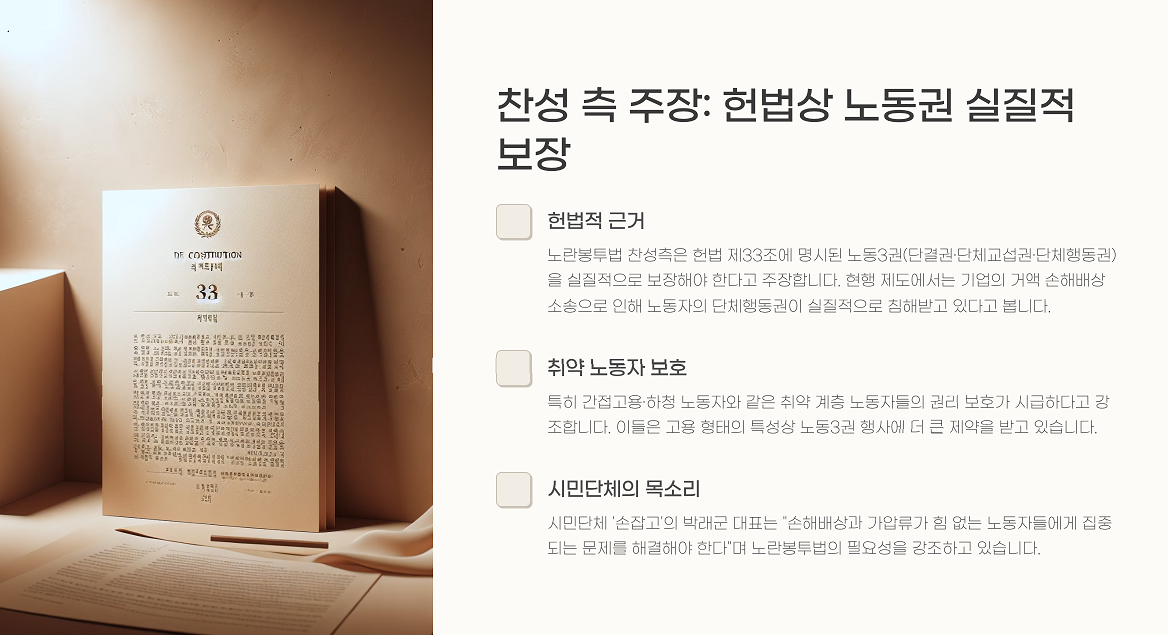 찬성 측은 헌법이 보장한 **노동3권(단결권, 단체교섭권, 단체행동권)**을 실질적으로 보장해야 한다고 주장합니다. 손배소는 그 자체로 ‘침묵의 압력’이기 때문이죠.