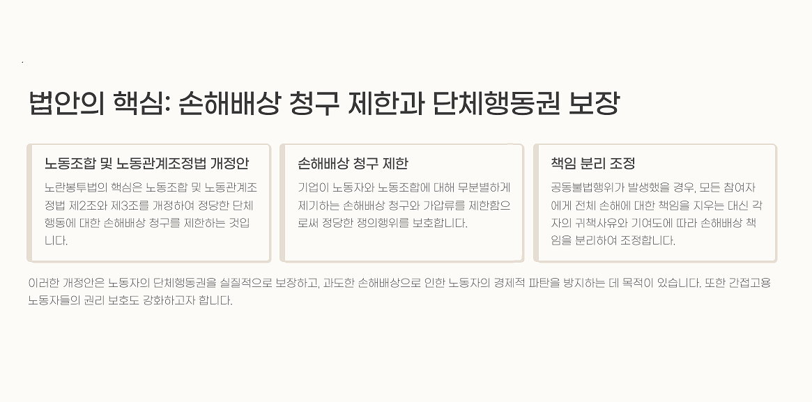 A. 기업이 무분별하게 손해배상 소송을 제기할 수 없게 되어 노동자의 단체행동권이 보다 실질적으로 보장됩니다. 하청·비정규직 노동자의 권리도 강화됩니다.
