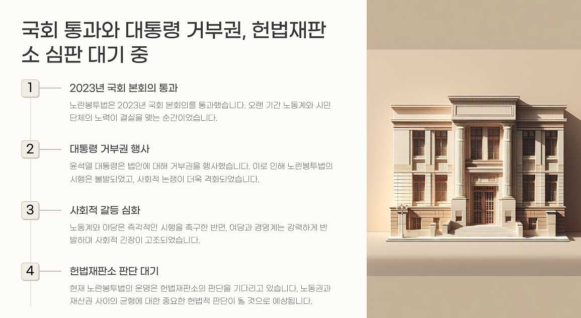 2023년 기준, 국회 본회의를 통과했지만 대통령의 거부권 행사로 법안은 좌초되었습니다. 현재까지도 헌법재판소의 판단을 기다리는 상황이며, 정치권의 첨예한 이해관계 속에서 법안의 존립 여부가 갈리고 있습니다.