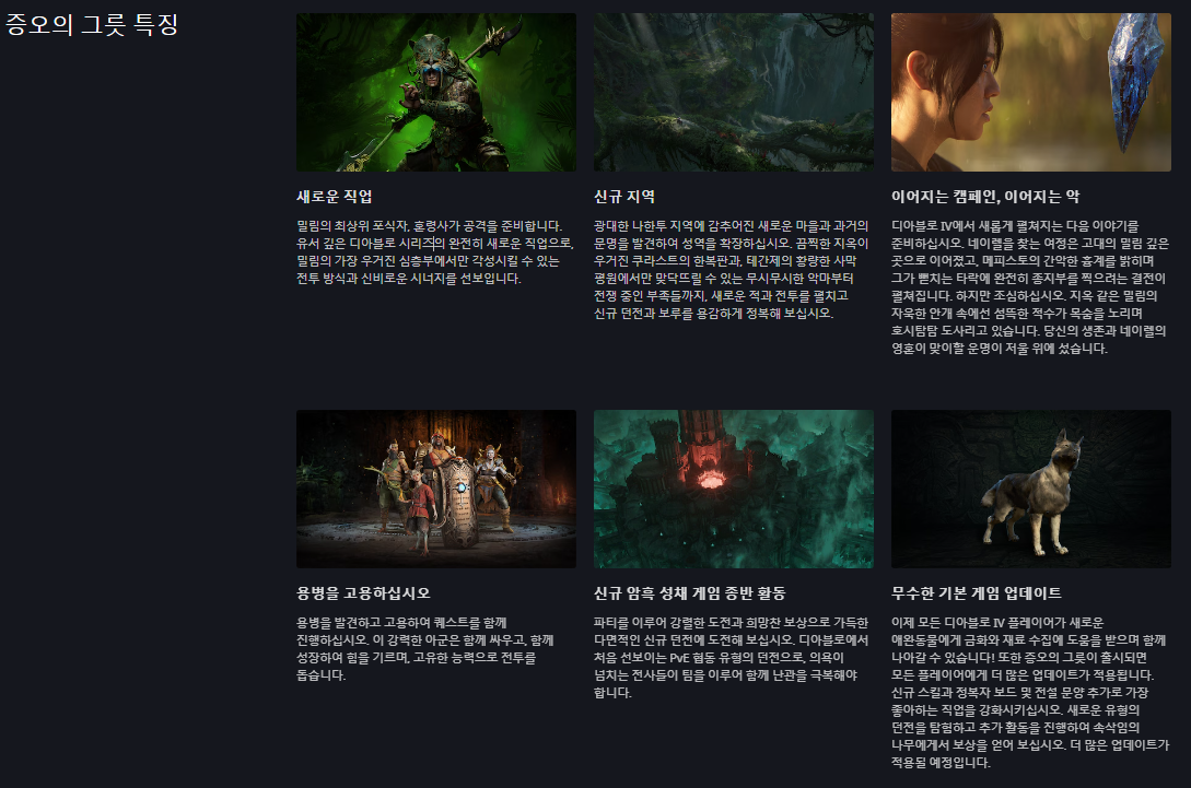 디아블로 4 확장팩의 가장 큰 특징은 신규 직업 혼령사의 출시입니다. 기존 디아블로 유저들의 의견에 따르면 디아블로 2의 드루이드와 디아블로 3의 부두술사가 합쳐진 느낌을 가진다고 합니다. 더불어 디아블로 4 일반판 이후 이어지는 스토리와 확장된 신규 지역 외에 다양한 컨텐츠가 업데이트 된다고 하니 기대가 됩니다.