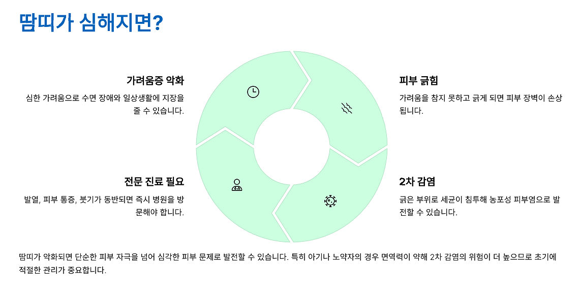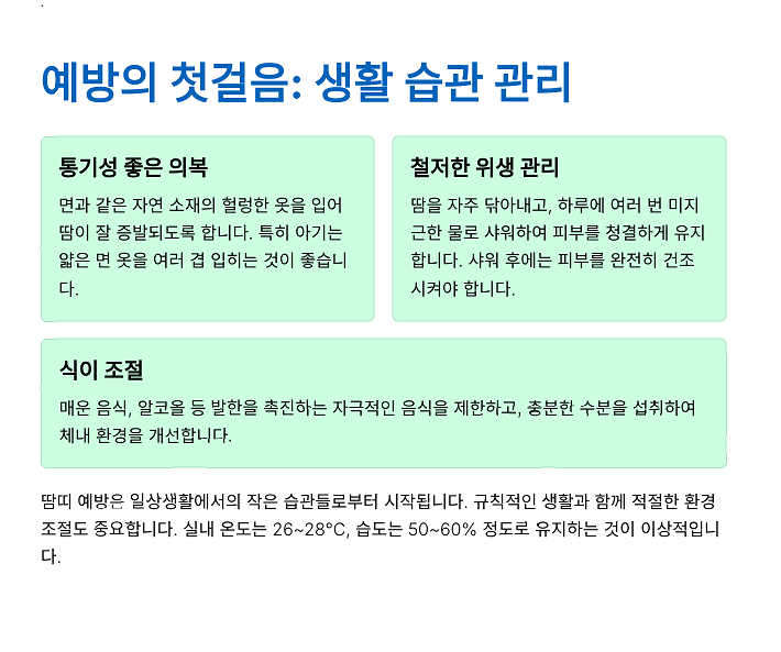 땀띠는 단순한 트러블로 끝나지 않습니다. 제대로 관리하지 않으면 세균 감염, 심지어 이차 피부염으로 이어질 수 있습니다. 이런 상황을 막으려면 다음 수칙을 반드시 지켜야 합니다.