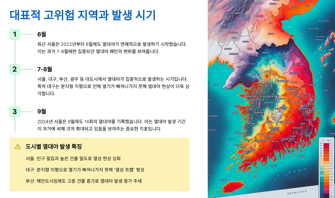 열대야는 남부지방, 해안지대, 대도시에서 주로 발생합니다.