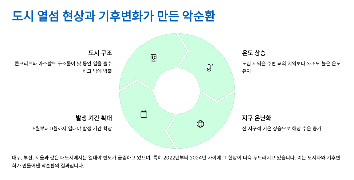 이러한 지역은 야간 냉방 수요 급증, 전력 사용량 폭등, 수면 장애, 심장질환 증가 등 실질적 피해도 동반됩니다.