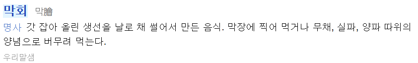 음... 뭐 어느 정도 맞는 것 같네요?  아무튼 생선회를 각종 야채와 함께 막장 또는 특제양념에 버무려 먹는 음식입니다.