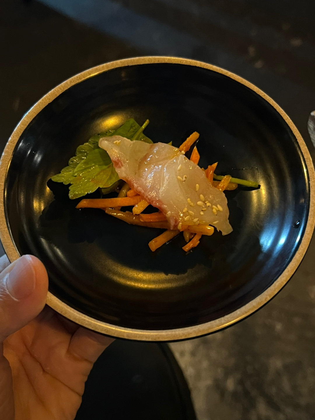 그래서 저 회 아래 무, 당근, 양파 등이 양념에 무쳐져 있었고 옆에는 미나리입니다.