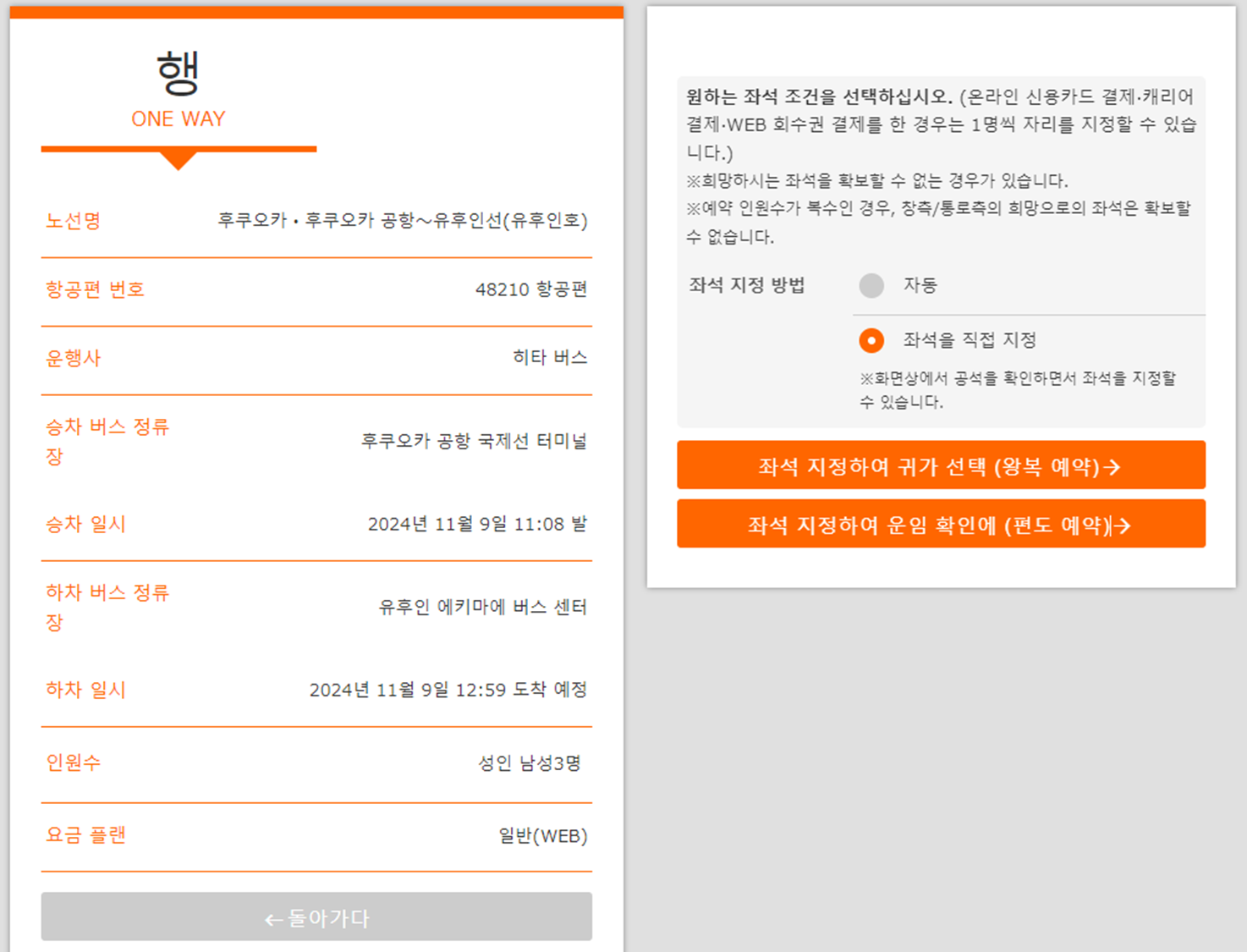 위 항목들에 맞게 왕복 일정 예매하시면 되고, 유후인 여행 후 하카타 또는 텐진으로 이동하여 여행일정이 있으시면 위 내용 참고하셔서 일정에 맞게 편도로 예약하시면 됩니다. 추가로 버스 예약은 승하차일 기준 한 달 전 오전 8시에 오픈되고 경쟁은 치열하다고 하니 다들 수강신청 하듯이 준비하셔야 합니다.