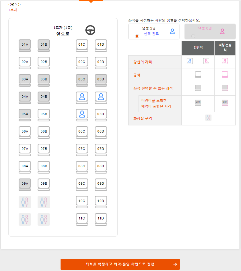 좌석 선택해 주시고 '좌석을 확정하고 예약, 운임 확인으로 진행' 클릭하면