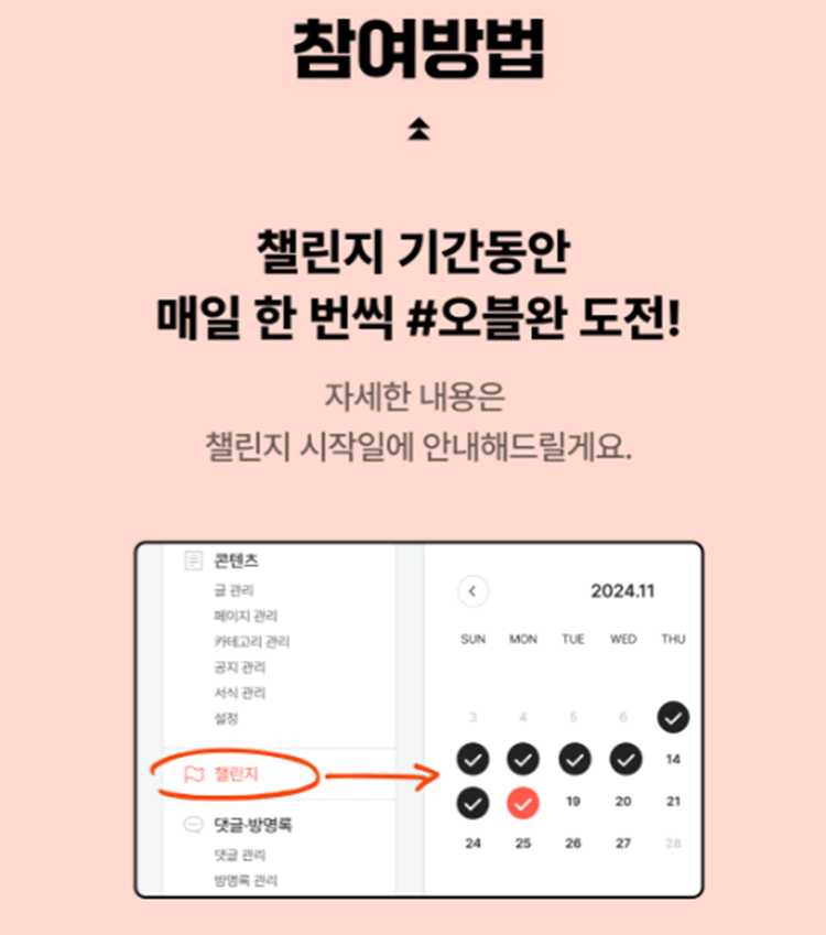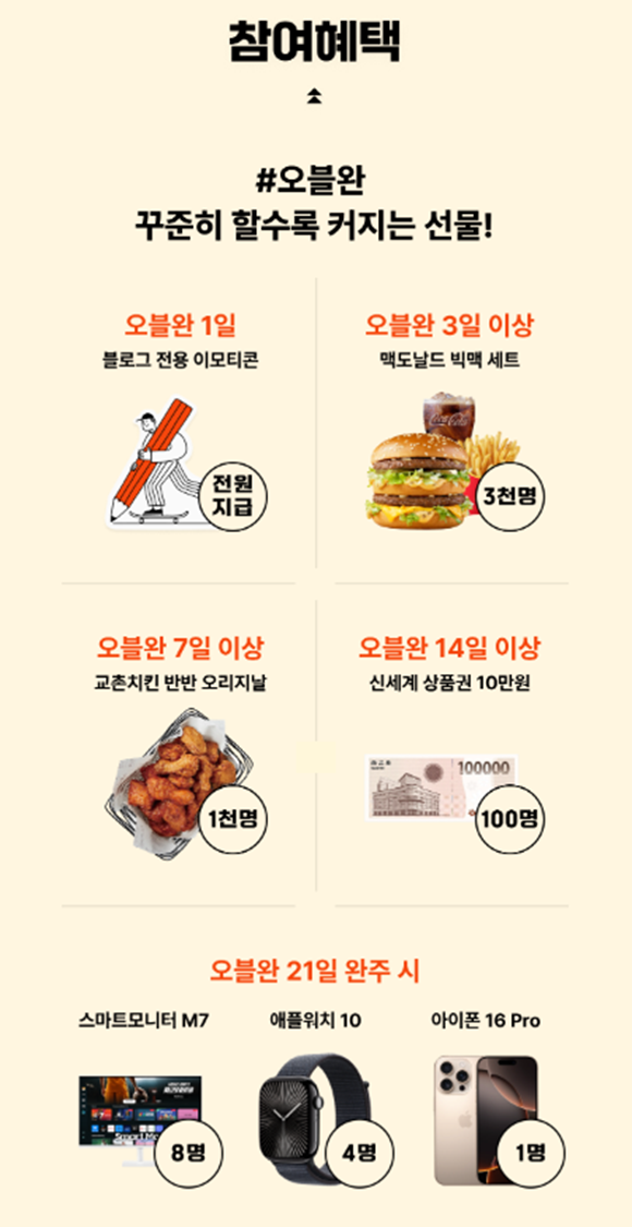일정은 2024.11.07(목)까지입니다. 어서어서 서두르시고요. 하루하루 오블완 챌린지를 완성해 나갈 때마다 다양한 상품도 추첨을 통해 지급된다고 하니 아주 재밌을 것 같습니다.