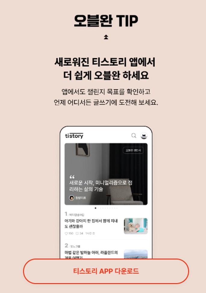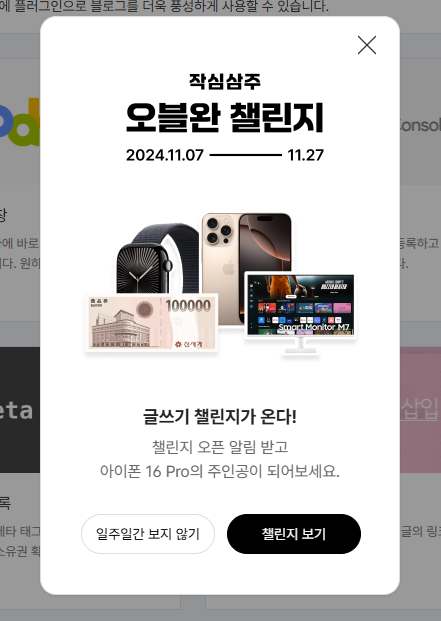 먼저 티스토리 메인 페이지로 들어가시면 이렇게 오블완 챌린지 이벤트에 대한 팝업이 뜹니다. 챌린지 보기를 누르시면 자세한 내용을 보실 수 있는데요. 내용은 아래와 같습니다.
