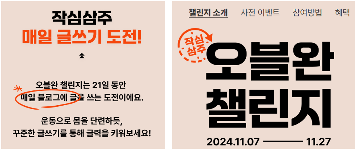 2024.11.07 ~ 2024.11.27의 총 21일의 기간 동안 매일 1개의 블로그 포스팅을 진행하면 되는 챌린지 이벤트입니다.