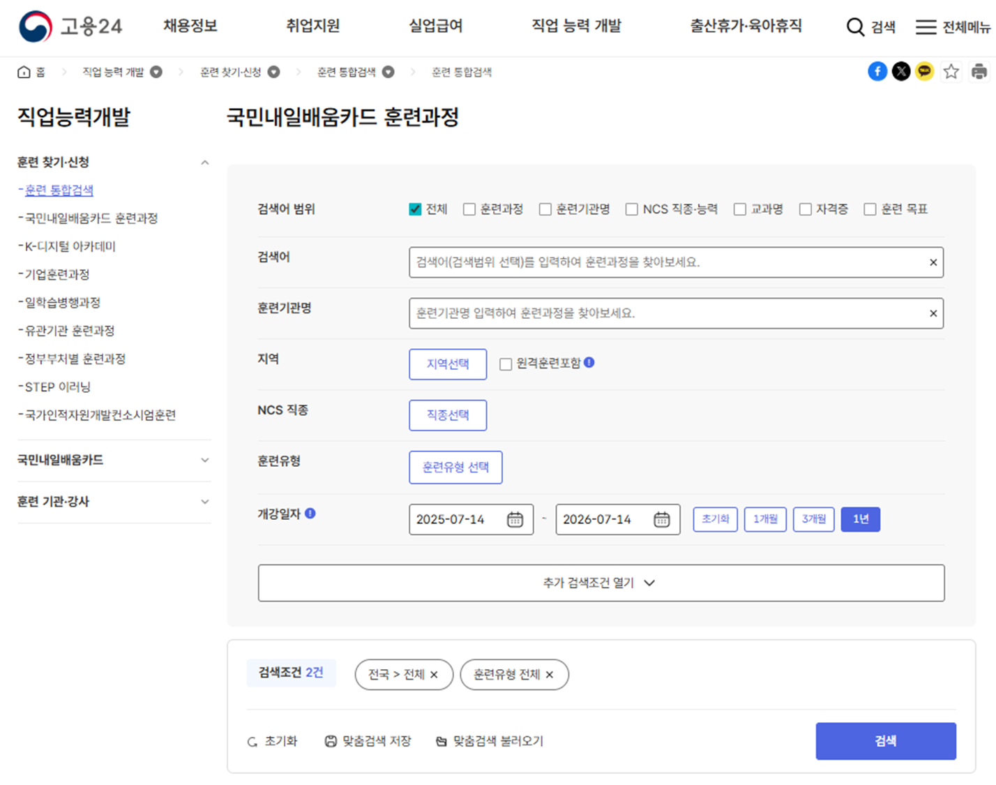 상단 탭 중 '직업 능력 개발' 클릭 후 '훈련 통합검색' 클릭하시면 국민내일배움카드로 수강할 수 있는 강의리스트를 조회하실 수 있습니다. 상당히 많은 종류의 강의가 있는 걸 확인하실 수 있으실텐데 본인에게 필요한 강의 찾아서 신청 후 들으시면 되겠습니다.
